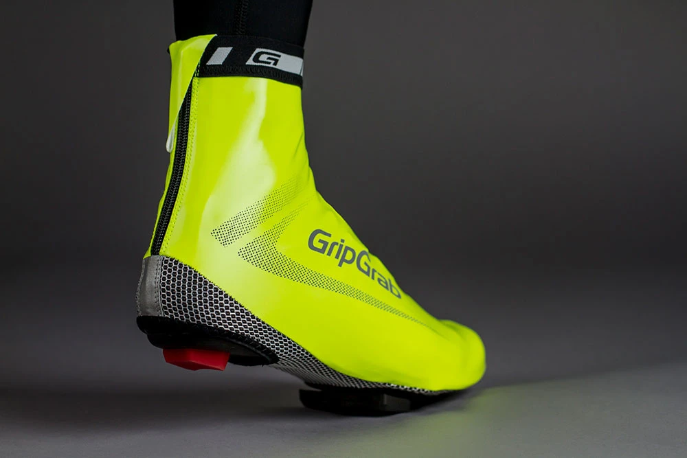 The waterproof stretch fabric gives a tight fit and the rear zipper makes it easy to pull over the shoe. Reflective print on the side of the covers along with the yellow fluorescent colour make for augmented visibility in low light conditions.